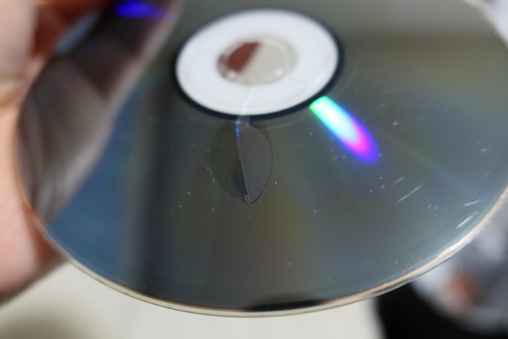 割れたのは記録面側で、ケースから出すときに反らすのが悪かったようです。