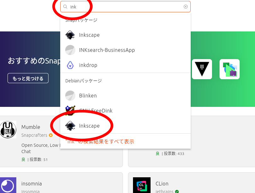 2. 上部の検索ボックスに「ink」と入力し、Debianパッケージの「Inkscape」をクリック。