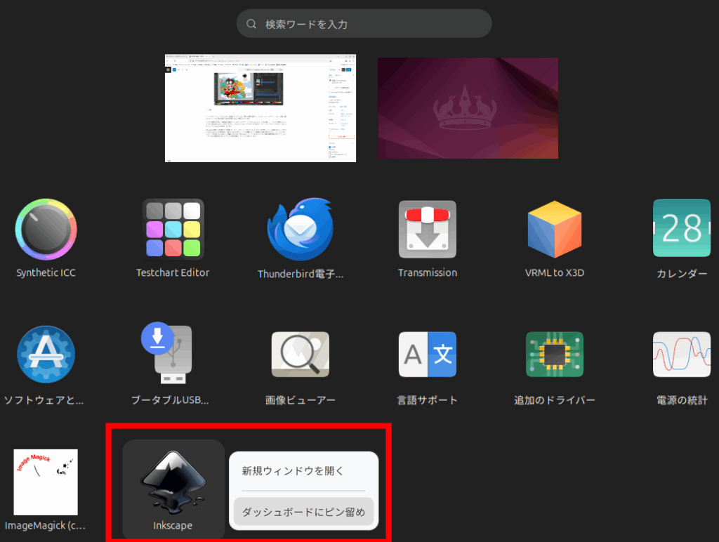 5.アプリ一覧です。Inkscapeのアイコンを右クリックして「ダッシュボードにピン留め」。